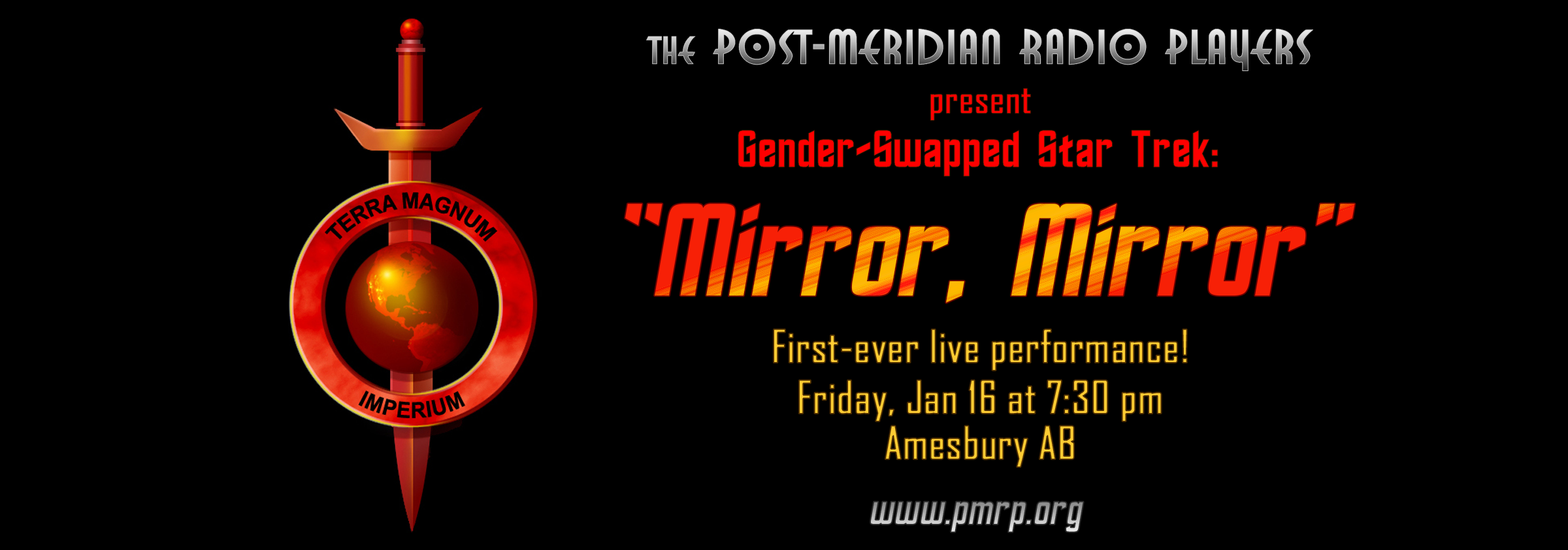 At the 2026 Arisia science-fiction convention, the Post-Meridian Radio Players will present our gender-swapped adaptation of the classic Star Trek episode “Mirror, Mirror”—a restaging of our 2021 virtual performance, now making its premiere on a live stage! (For information on Arisia, go to https://www.arisia.org/)